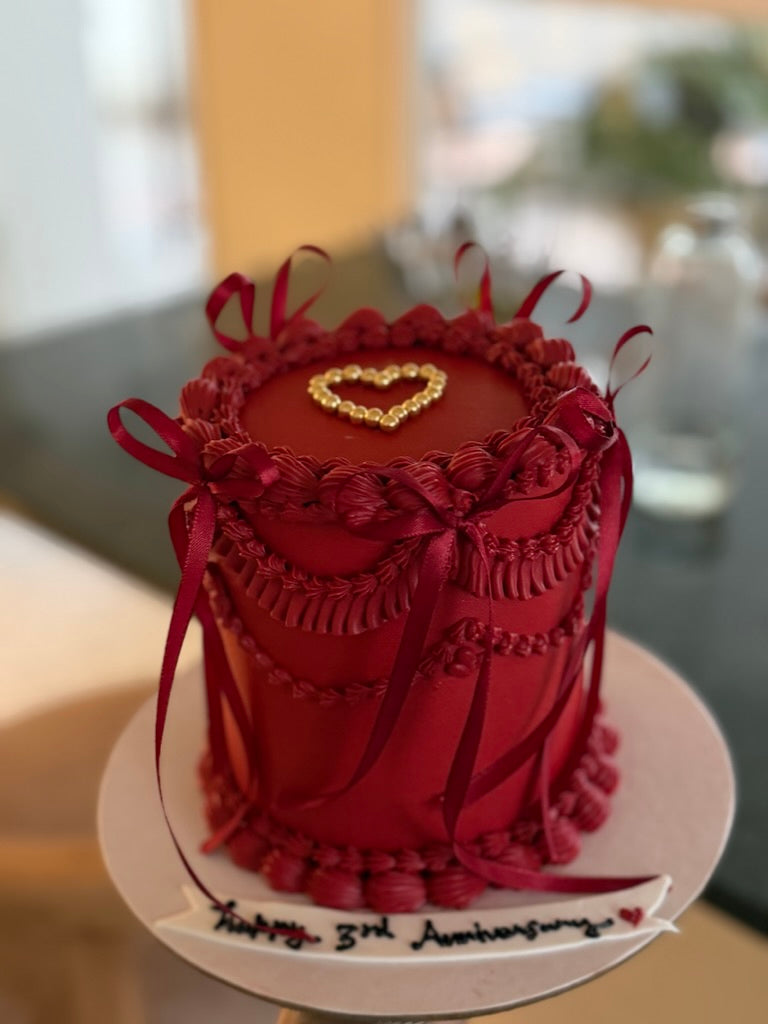 The Victorian Heart Cake is handcrafted in a deep scarlet finish and adorned with delicate vintage-style piping, silky ribbon details, and a classic pearl heart centerpiece. Designed for intimate celebrations, this petite cake blends timeless Victorian aesthetics with modern elegance.